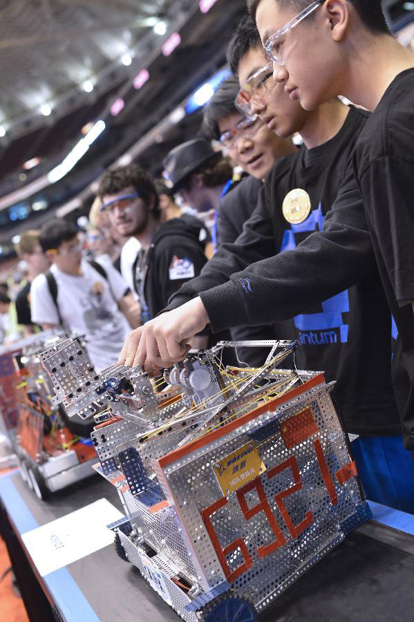 為期4天的本次FIRST機(jī)器人大賽全球總決賽于4月底在美國圣路易斯舉辦,吸引了來自世界各地的數(shù)百支隊伍。由中國北京牛欄山一中、陳經(jīng)綸中學(xué)望京分校以及人大附中西山分校的13學(xué)生和3名指導(dǎo)老師組成的“量子方塊”隊首次亮相,參加了針對中學(xué)生的“技術(shù)挑戰(zhàn)賽”。他們各自發(fā)揮所長,分成參賽組、外聯(lián)組、信息組等,分工合作。雖然來自不同的學(xué)校,不同的年級,但是,大家為著共同的愛好走在一起,合作親密無間。