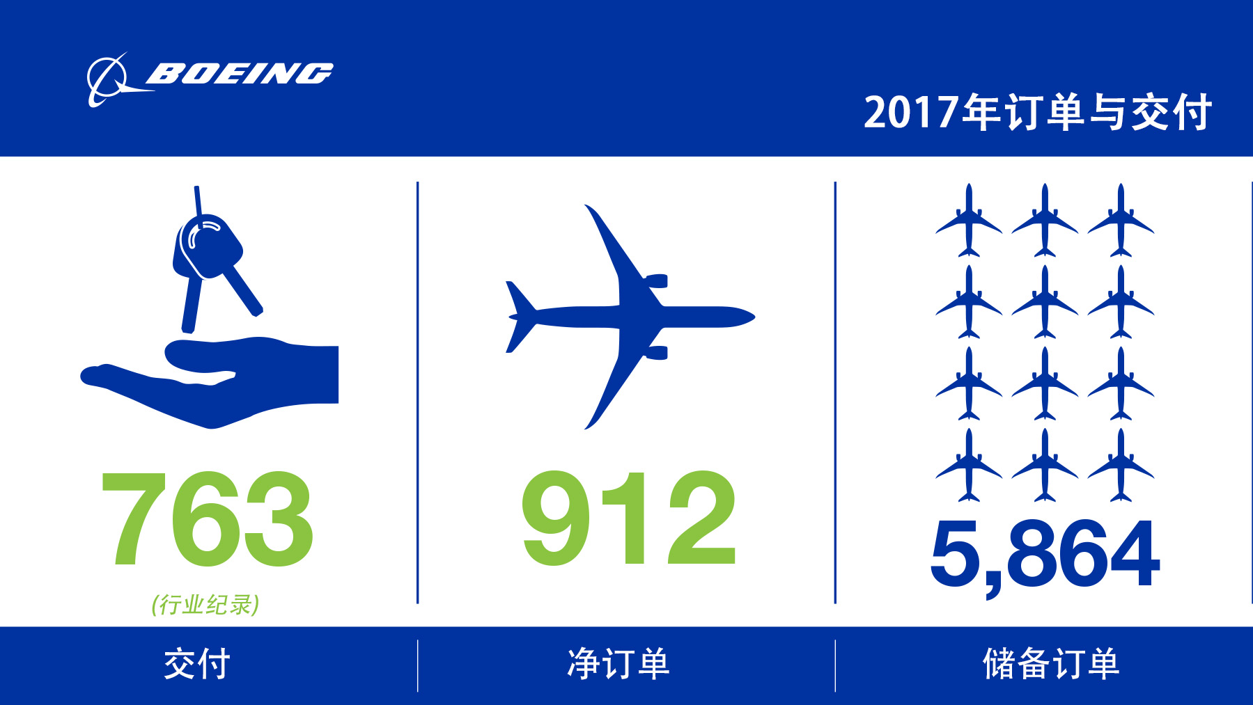 2018年1月9日,西雅圖——在市場領先的737和787夢想飛機的高產出的驅動下,波音在2017年連續第六年在飛機制造商中交付最多飛機,并創造交付763架的行業紀錄。同時,公司收獲912架凈訂單,反映了其單通道飛機和雙通道飛機的健康需求。