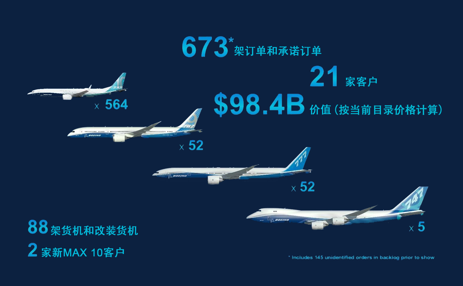 在民用航空訂單方面,波音在過去一周中表現(xiàn)出色,與客戶宣布了總計673架飛機的訂單和承諾訂單,顯示了貨機需求的持續(xù)反彈和737MAX、787等客機機型的銷售活力。波音收獲了48架777貨機、5架747-8貨機的訂單和承諾訂單,反映出全球貨運市場的不斷走強。