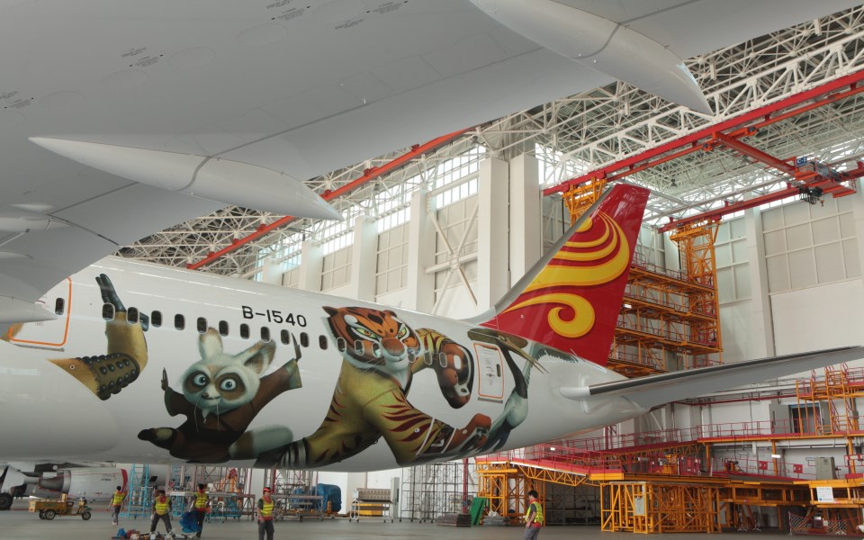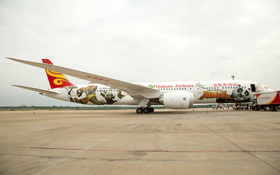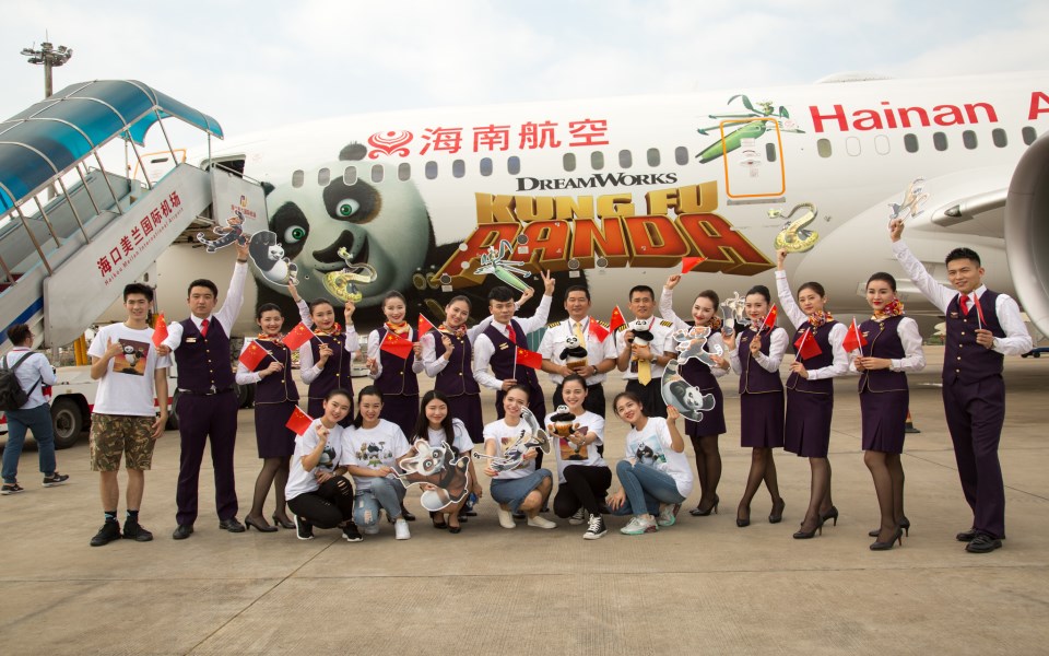 2016年10月1日,海南航空 “功夫熊貓”主題涂裝波音787-9飛機驚艷亮相并完成首航,熊貓阿寶、師父、悍嬌虎、仙鶴、螳螂、靈蛇、金猴的形象登上同時海航波音787-9飛機,飛機的客艙內飾也滿滿是功夫熊貓主題。
